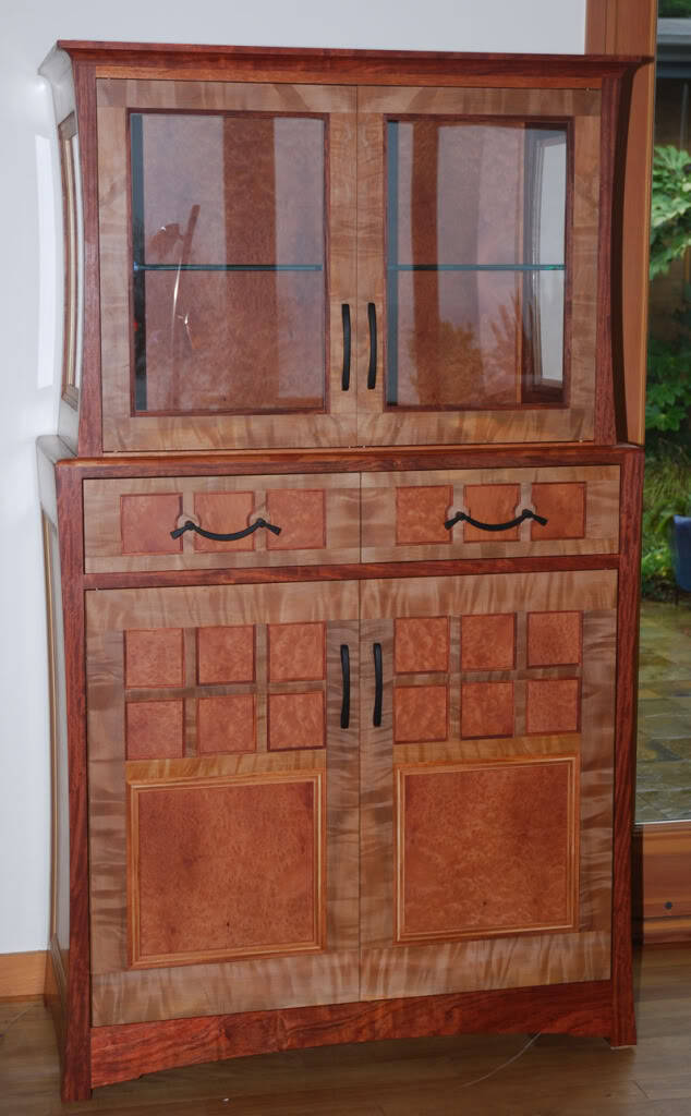 Vitrine cabinet in bubinga, curly arbutus and arbutus burl, featuring solid ebony handles